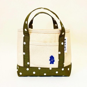 新作!3個限定。水玉オリーブ!しがないTシャツ屋の"ドライブ用帆布ミニトートバッグ”(190mm×210mm )ナチュラル×水玉オリーブ